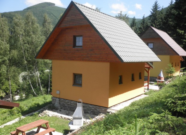 Každá chata má zastřešenou verandu a terasu s posezením a venkovním krbem. K dispozici je rovněž venkovní ohniště, pískoviště a travnaté hřiště se sítí na míčové hry. Parkování v objektu zdarma. Všechny chaty jsou situovány v mírně kopcovitém terénu.